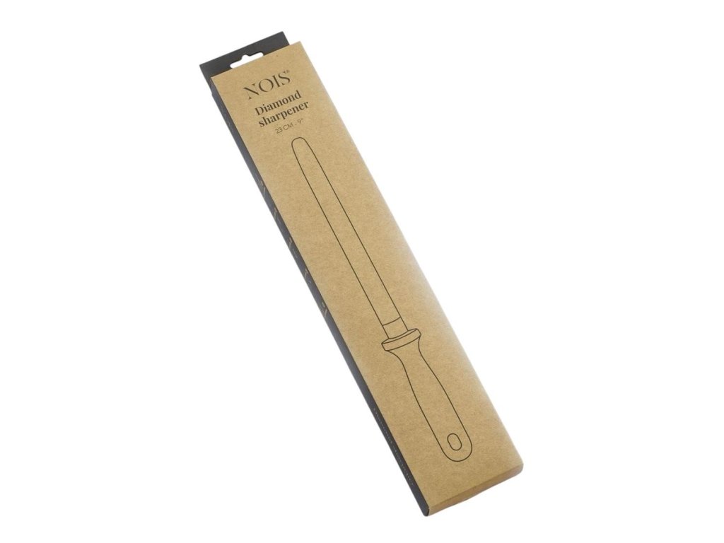 DIAMANTOVÁ OCIEĽKA NA NOŽE - Robustná konštrukcia s celkovou dĺžkou 34,8 cm a 23 cm dlhým brúsnym priestorom zaručuje pohodlnú prácu a veľkú brúsnu plochu. Čierna rukoväť vyrobená z odolného PP plastu je ergonomicky navrhnutá – perfektne padne do ruky a nekĺže ani pri intenzívnom používaní. Dodatočný otvor v rukoväti umožňuje jednoduché zavesenie na háčik, vďaka čomu je vždy po ruke bez toho, aby zaberal miesto v zásuvke. Ocieľka na nože NOIS kombinuje kvalitu s jednoduchým používaním – je nenahraditeľným doplnkom do každej kuchyne.