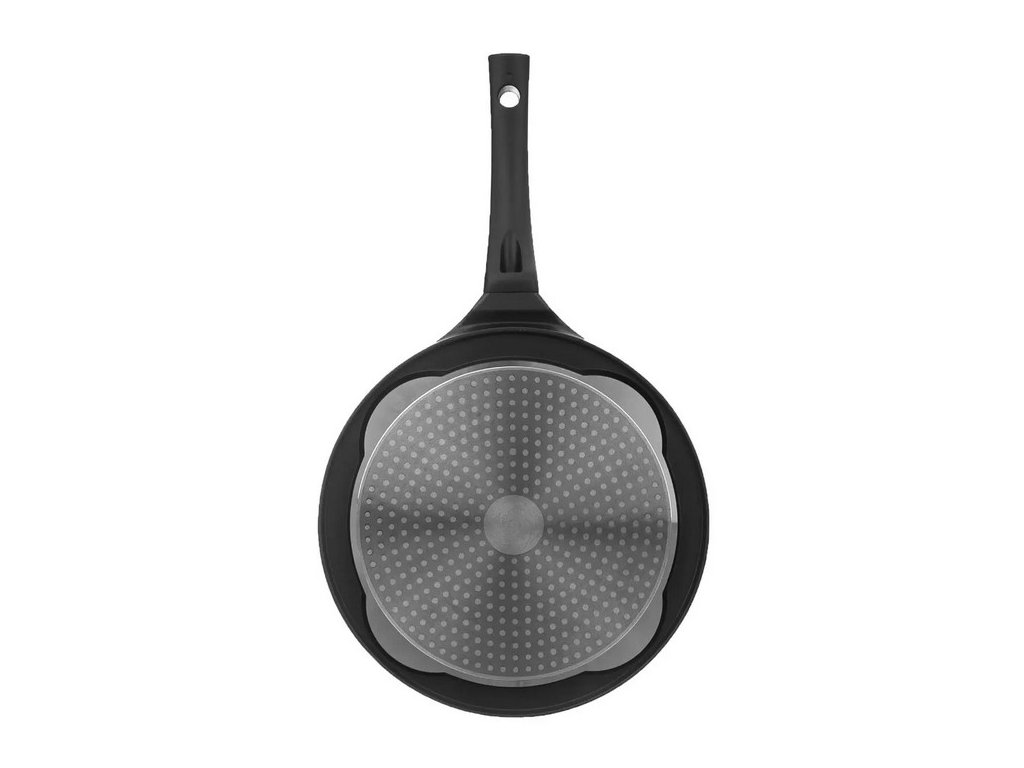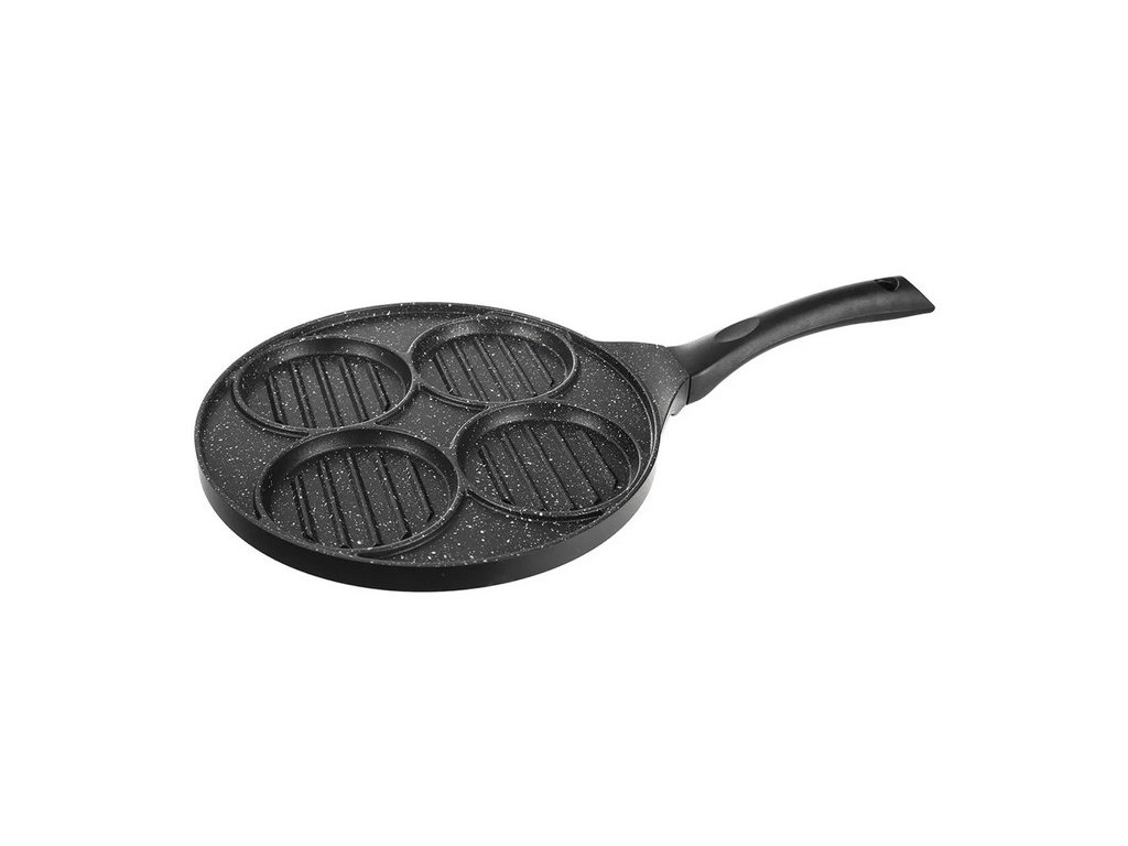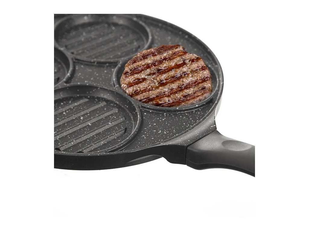 Panvica na hamburgery je odlievaná masívna panvica so zníženým okrajom a s veľmi kvalitným nepriľnavým povrchom PFLUON GRANIT. Je určená pre prípravu mäsových aj zeleninových placiek s minimálnou potrebou tuku. Štyri sekcie, vrúbkované dno sekcií. Materiál: hliník s vynikajúcim nepriľnavým povrchom PFLUON GRANIT a s profilovaným dnom, bakelit (rukoväť). Možnosť zavesenia. Rozmery: pr. 26,5 cm, v. 1,8 cm, pr. jednej sekcie 10 cm. Vhodná na všetky typy spotrebičov vrátane indukcie.